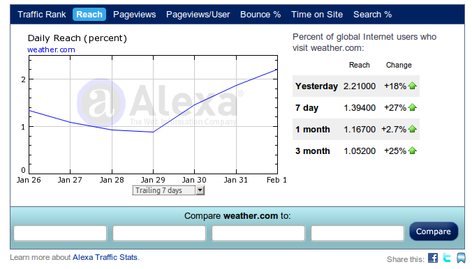 Here’s a great example of the Weather.com network getting a stink load of attention thanks to their anchorman Jim Cantore. This single video got the Weather Network a whole lot more traffic for free despite the amount of people glued to their website and channel. It’s interesting just to see how much more traffic an event like this will show up, sadly I have to use Alexa for the meantime.